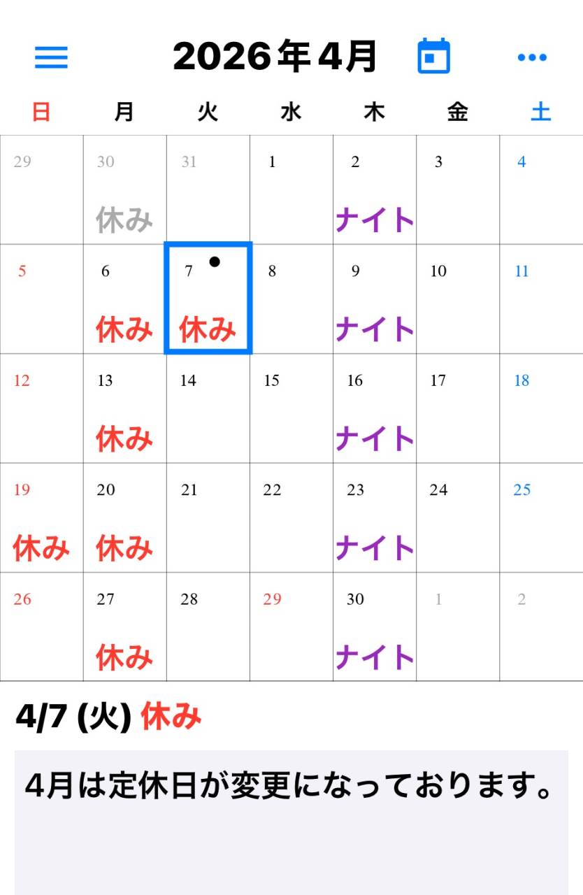ナイト とはナイトデーの事です。毎週木曜日13時から20時までの営業。